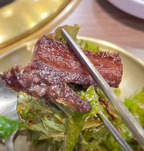 - 팬을 연기가 살짝 날 정도로 강하게 달군 뒤, 고기를 올리고 앞뒷면을 각각 1분 30초씩 시어링하여 육즙을 가둡니다.