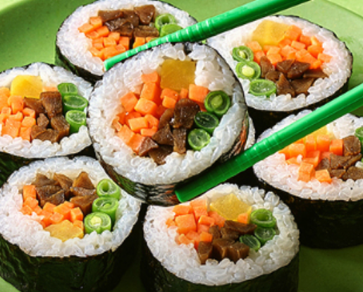| 야채 비건 김밥 | 신선한 채소와 우리 쌀의 조화가 돋보이는 구성 | 저칼로리 건강식 |