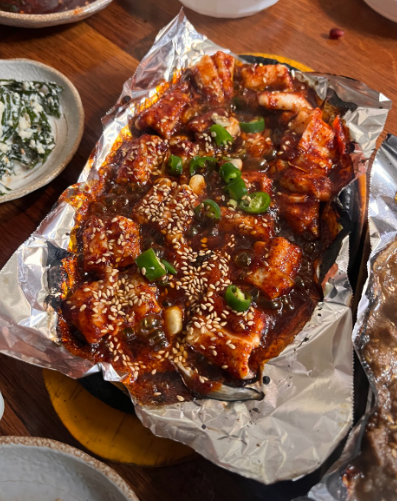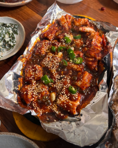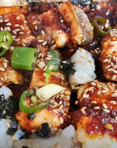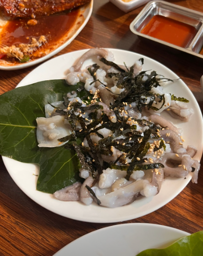 - 5. 볼에 해산물과 야채, 양념장을 넣고 살살 버무려 통깨를 뿌려 마무리합니다. 창원 45년 전통 통술집 느낌의 시원한 소주와 함께 즐겨보세요.