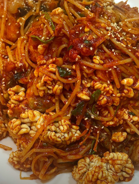 - 조리 3단계: 데쳐둔 해산물과 미리 섞어둔 양념장을 팬에 넣고 센 불에서 빠르게 버무리듯 볶아줍니다.