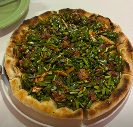 - 4. 구워진 피자 위에 양념된 꼬막과 잘게 썬 부추를 듬뿍 올려주면 강릉 꼬막피자 완성입니다.