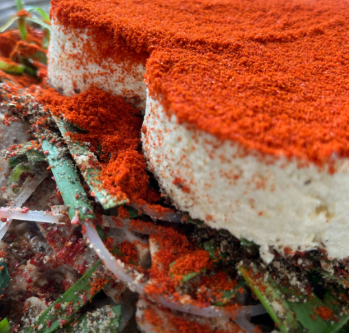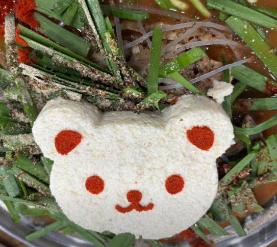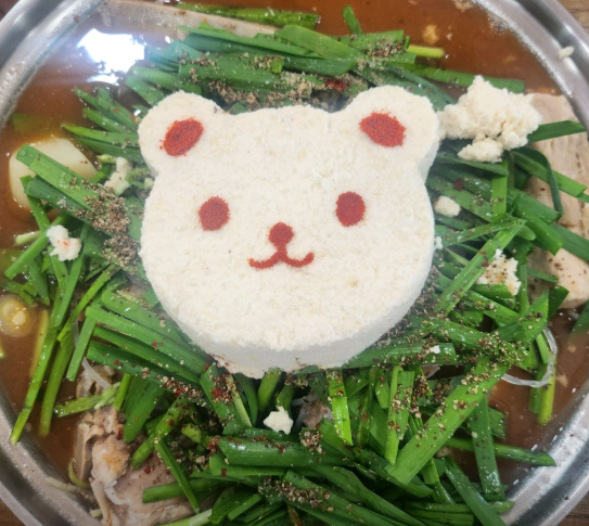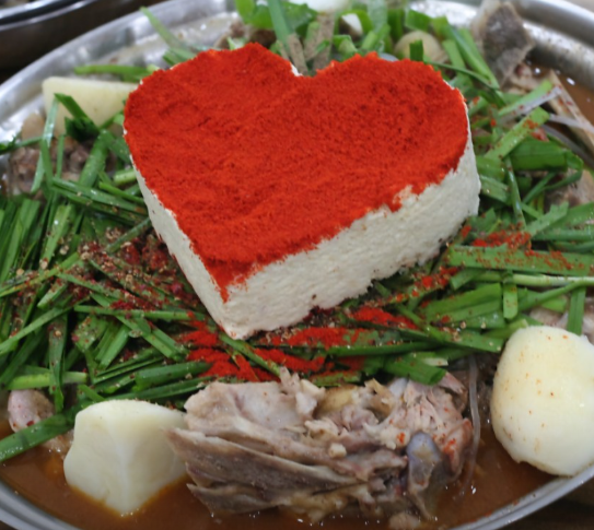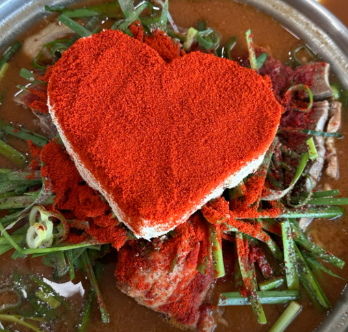4. 끓는 감자탕 위에 짤주머니를 이용해 하트 모양으로 콩 크림을 올리면 하트콩크림감자탕 완성입니다.