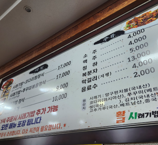 | 시래기밥 코다리찜 | 17,000원 | 대표 메뉴 (2인 이상 추천) |