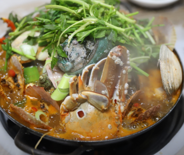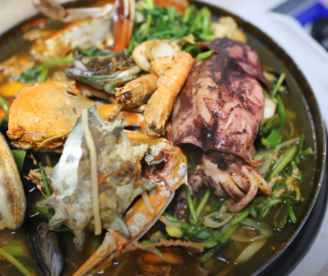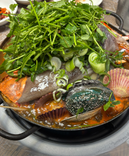 - 재료: 모둠 해산물(조개, 새우, 낙지 등), 무, 대파, 쑥갓, 콩나물