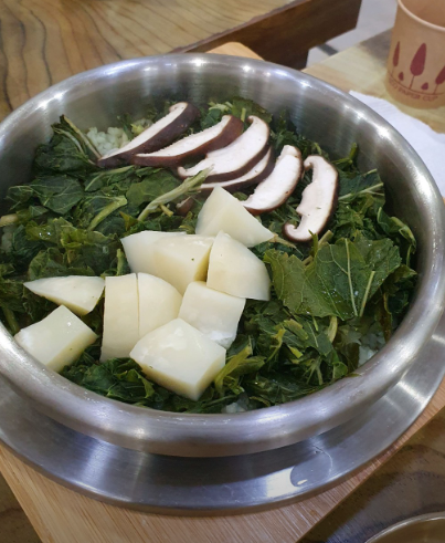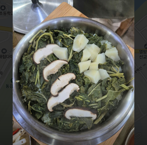 • 2. 솥에 씻은 쌀을 안치고 그 위에 어수리 나물을 듬뿍 올립니다. 이것이 영월 어수리더덕정식, 해천한방 닭백숙 향기의 핵심입니다.