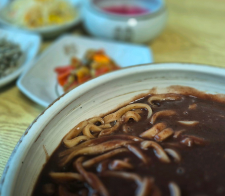 이곳의 메뉴는 단순하지만 강력합니다. 가장 대표적인 메뉴는 역시 팥 칼국수입니다. 직접 밀어낸 쫄깃한 면발과 진한 팥 국물의 만남은 환상적인 밸런스를 보여줍니다. 면발 사이사이 배어든 팥의 풍미는 씹을수록 고소함을 더합니다. 또한, 새알심이 가득 들어간 팥 옹심이(새알심)는 쫀득한 식감을 좋아하시는 분들에게 최고의 선택지입니다.