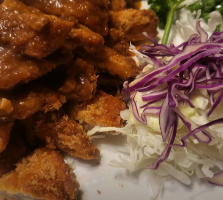 먼저 돼지고기 등심을 준비해 칼집을 넣어 연육한 뒤 소금과 후추로 밑간을 한다. 밀가루, 계란물, 빵가루 순으로 입혀 170도 기름에서 노릇하게 튀긴다.