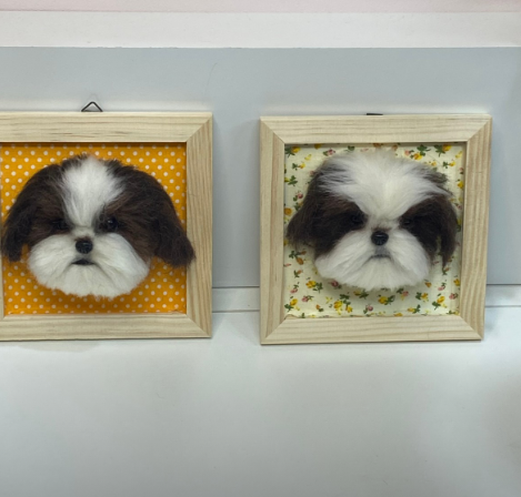 - 준비물: 니들 펠트 전용 바늘(1구/3구), 양모 솜(반려동물 털 색상), 스펀지 패드, 인형 눈 부속, 펠트 원단 조각.