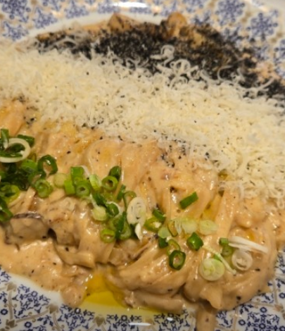 - 4. 크림 또는 면수를 부어 농도를 맞춘 뒤 삶은 면을 넣고 소스가 잘 배도록 버무려 마무리합니다.