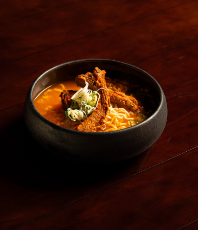 - 4. 팬 한쪽에 파를 구워 향을 입히고 토치로 불향을 더해 마무리합니다.