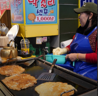 대박 감자전 매장 한편에는 막걸리를 셀프로 즐길 수 있는 공간이 있어, 7,000원이라는 저렴한 가격의 감자전 한 접시와 함께 최고의 궁합을 이룹니다. 감자전 테두리의 바삭한 부분은 아이들에게, 촉촉한 안쪽 부분은 어르신들에게 인기가 많습니다. 감자전 속에 다른 첨가물을 넣지 않아 감자 본연의 담백한 풍미가 살아있습니다. 대박 감자전 조리 과정을 지켜보는 것 또한 시장을 찾은 즐거움 중 하나입니다.