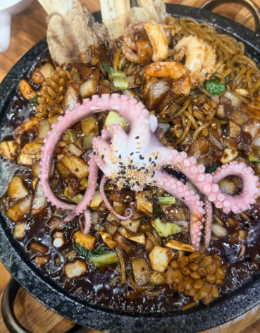 - 4. 대구 왕갈비해물돌판자장 느낌을 내기 위해 면수를 한 국자 넣고 지글지글 볶아줍니다.