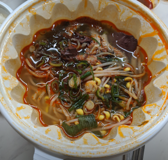 - 재료: 소사골 육수 500ml, 삶은 양 또는 내장(시판용 가능), 콩나물 한 줌, 선지(선택), 대파, 청양고추