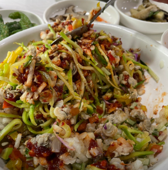 - 양념장: 고추장 2큰술, 고춧가루 1큰술, 식초 3큰술, 설탕 1.5큰술, 올리고당 1큰술, 다진 마늘 1큰술, 참기름, 깨
