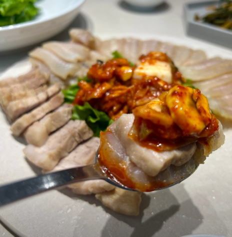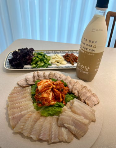 - 세팅하기: 접시 중앙에 묵은지를 두고 한쪽에는 수육, 한쪽에는 목포 홍어를 배치합니다.