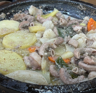 - 굽기: 팬에 식용유를 살짝 두르고 마늘 향을 낸 뒤, 초벌한 내장을 노릇하게 굽습니다. 기름이 나오기 시작하면 양파와 대파를 넣습니다.